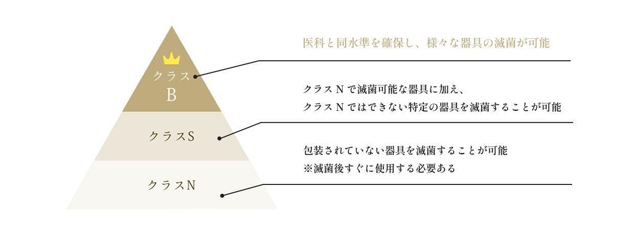 クラスB滅菌器は、ヨーロッパの厳しい基準(EN13060)を満たした高性能な滅菌システムです。複雑な構造を持つ器具の内部まで蒸気を行き渡らせ、あらゆる菌やウイルスを滅菌します。当院ではこのクラスB滅菌器を導入し、治療に使用するすべての器具を患者さんごとに処理。見えない部分まで清潔さを追求し、安全で信頼できる医療環境を整えています。
