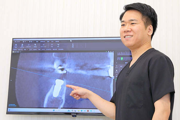 当院では、インプラント治療の安全性と精度を高めるため、歯科用CTやサージカルガイド、専用オペ室を導入しています。骨や神経の位置を立体的に把握し、シミュレーション通りの正確な埋入を実現。清潔な環境で、安心して手術を受けていただけます。