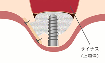 上あごの骨が薄い場合に、インプラントを埋入する部分から上顎洞の底を少し持ち上げて骨を補う方法です。大きな切開を必要とせず、低侵襲で行えるのが特長です。インプラントと同時に施術できるため、治療期間の短縮にもつながります。