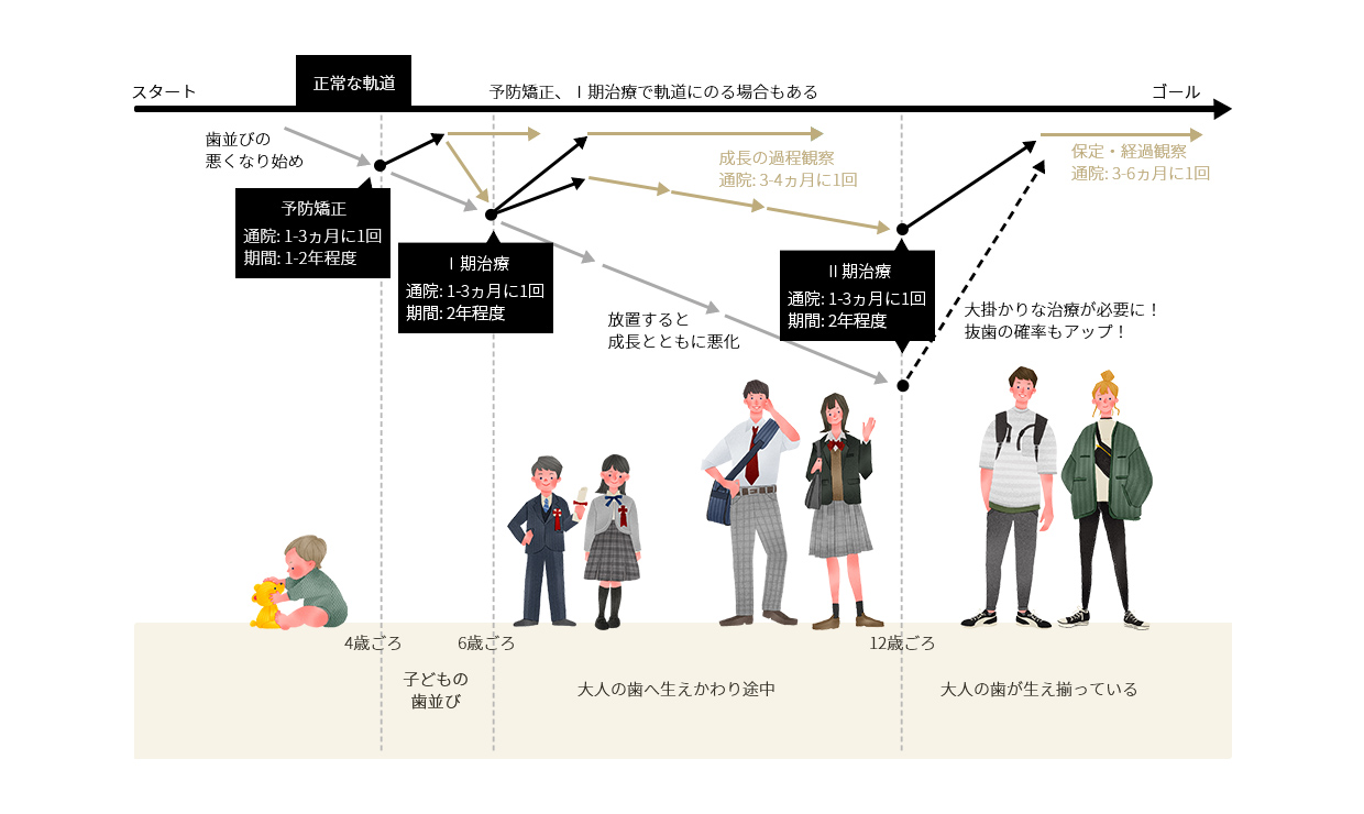 お子さんの矯正治療は、大きく「Ⅰ期治療」と「Ⅱ期治療」に分けられます。Ⅰ期治療は、乳歯と永久歯が混ざる6~10歳頃に行われ、顎の成長や歯の生えるスペースを整えることを目的としています。一方、Ⅱ期治療は永久歯が生えそろう12歳前後から行い、歯並びや噛み合わせを最終的に整える段階です。お子さんの成長や歯の交換状況によって、開始時期は異なります。