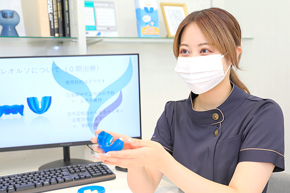 やわらかい素材でできたマウスピース型の矯正装置です。歯並びだけでなく、口呼吸や舌の位置など、お口の機能改善にも効果が期待できます。就寝時や日中の決められた時間に使用し、少ない負担で無理なく始められる矯正方法です。