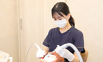 歯科衛生士が専用の器具と研磨剤を使用し、歯の表面を徹底的にクリーニングする方法です。バイオフィルム(細菌膜)を除去し、むし歯や歯周病の再発を予防します。着色やざらつきを抑え、ツルツルとした爽快感のある口もとへ導きます。